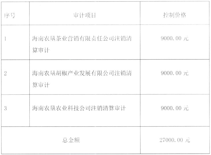 2023-08-31海南省農(nóng)墾五指山茶業(yè)集團(tuán)股份有限公司旗下海南農(nóng)墾茶業(yè)營銷有限責(zé)任公司、海南農(nóng)墾胡椒產(chǎn)業(yè)發(fā)展有限公司、海南農(nóng)墾農(nóng)業(yè)科技公司共3家公司進(jìn)行注銷,現(xiàn)擬選聘會計師事務(wù)所依法對上述3家公司開展清算審計,特邀請符合...